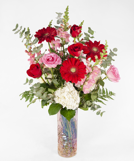 Celebrate a love that lasts forever with My Forever, a romantic Valentine’s Day arrangement designed to make hearts flutter. This lush bouquet features vibrant red gerbera daisies and classic red roses paired with soft pink roses, delicate pink snapdragons, and full white hydrangea for a beautiful balance of passion and sweetness. Baby eucalyptus adds a fresh, airy touch and gentle fragrance.